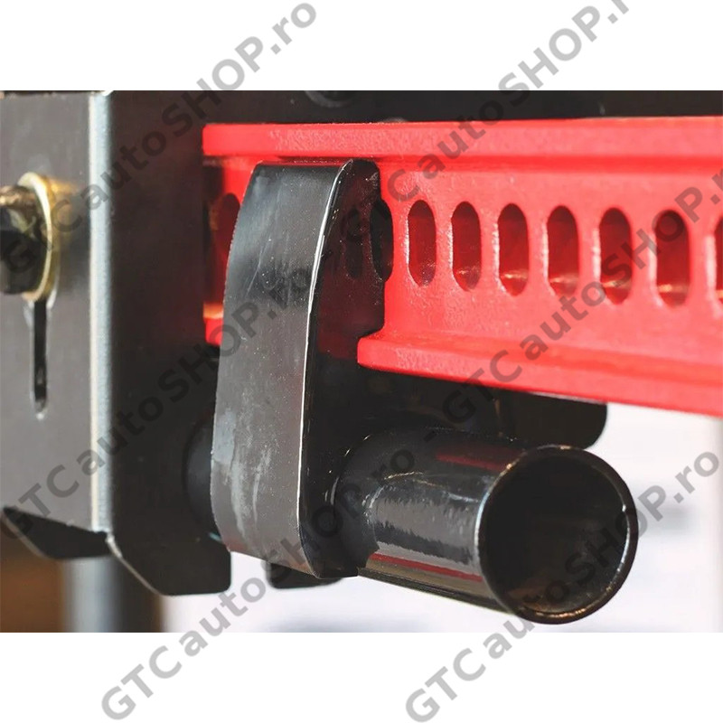 Un "buton de prindere" mentine dispozitivul fix intre treptele tijei cricului Hi-Lift.