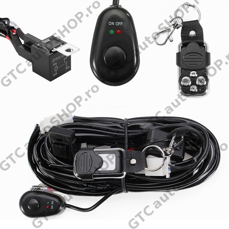 Cablaj wireless cu telecomanda, buton ON/OFF, releu si siguranta pentru pornirea/oprirea a unuia sau a mai multor proiectoare/led bar cu puterea totala insumata de maxim 288W.