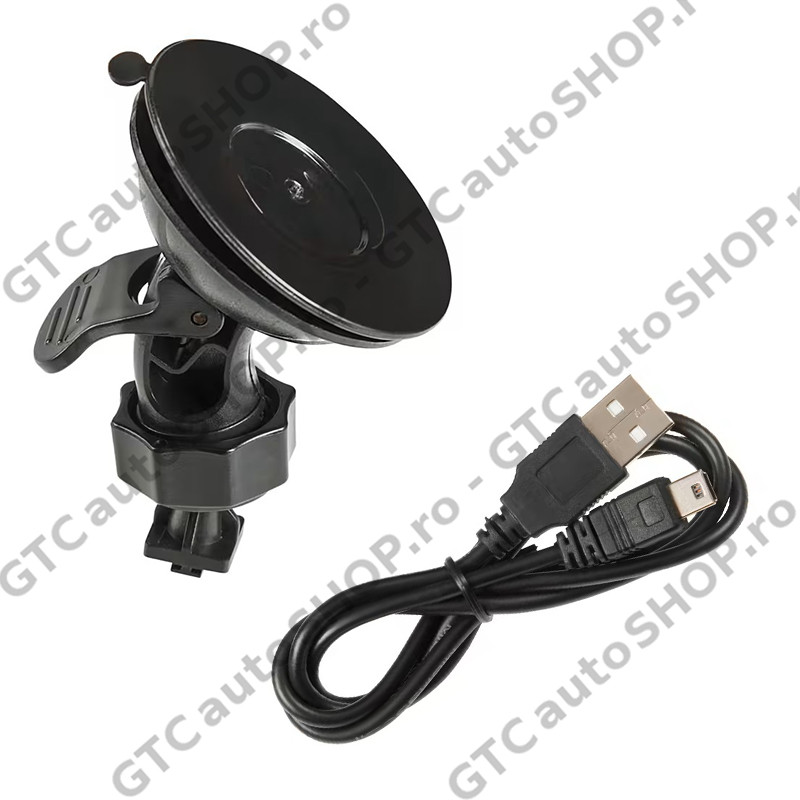Pachetul include camera frontala cu suport pentru parbriz si cablu de alimentare.