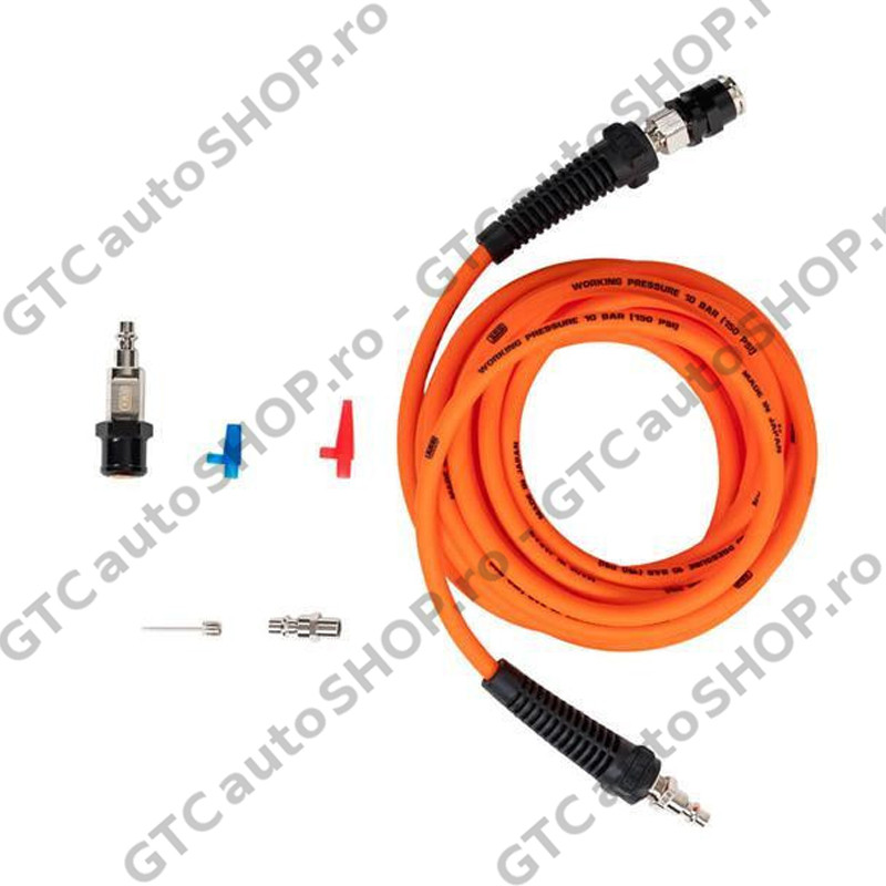 Include furtun de aer de 7m si cap de umflare pentru anvelope, plus alte accesorii de umflat.