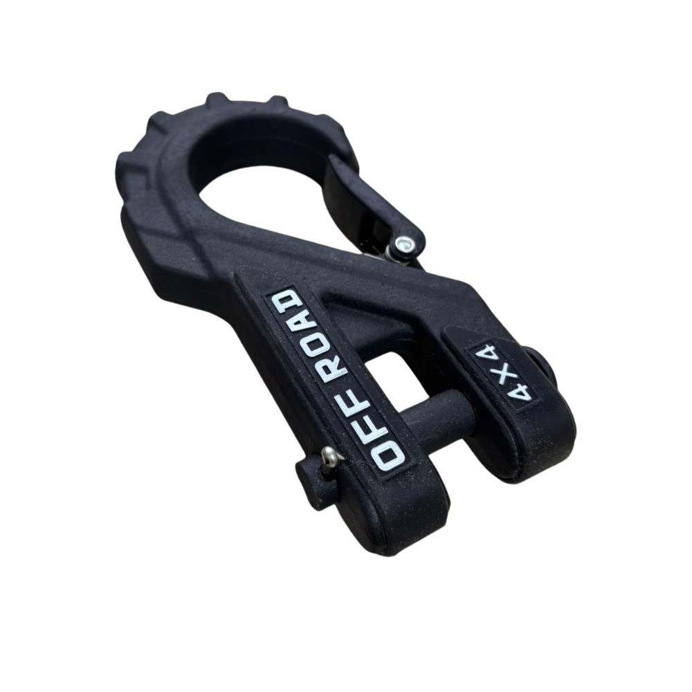 Cârligul de troliu EMD4x4 este gândit pentru utilizare cu cablu sintetic și are un avantaj practic important: când cablul este tras complet, cârligul se poate sprijini pe fanta (ghidajul) troliului, astfel încât îl poți poziționa mai bine și nu rămâne atârnat.