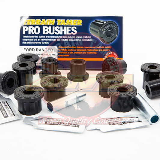 Bucsele Terrain Tamer Pro sunt din Elastomer sintetic, care combina elasticitatea cauciucului cu rezistenta bucselor sintetice. Sunt mai rezistente decat poliuretanul, mai ales in zone cu umiditate ridicata. Compusul elastomer sintetic solid păstrează forma și memoria și maximizează flexibilitatea. Rezistent la uleiuri, substanțe chimice și intemperii. La montare se foloseste vaselina speciala livrata in kitul de bucse!