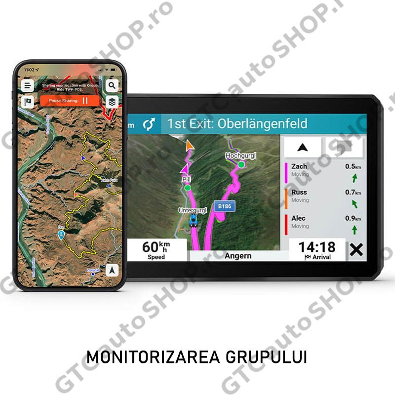 Monitorizarea grupului - Utilizează aplicaţia Tread pe smartphone-ul şi/sau dispozitivul tău zūmo XT2 pentru a urmări prietenii prin funcţia pentru mobil Cursă în grup. Sau utilizează accesoriul Tracker pentru curse în grup 2 (comercializat separat) pentru a urmări alţi motociclişti prin zūmo XT2, fără a fi necesară acoperirea unei reţele mobile.
