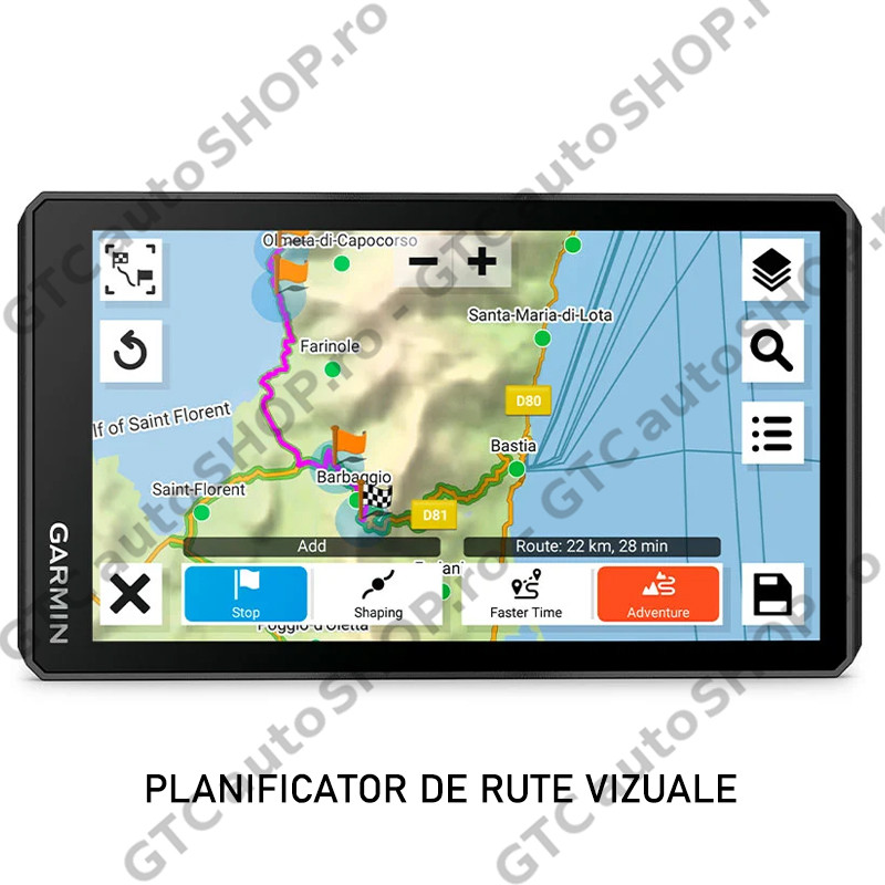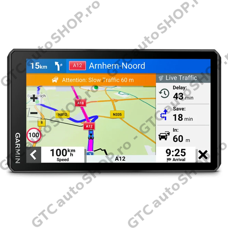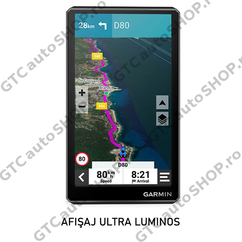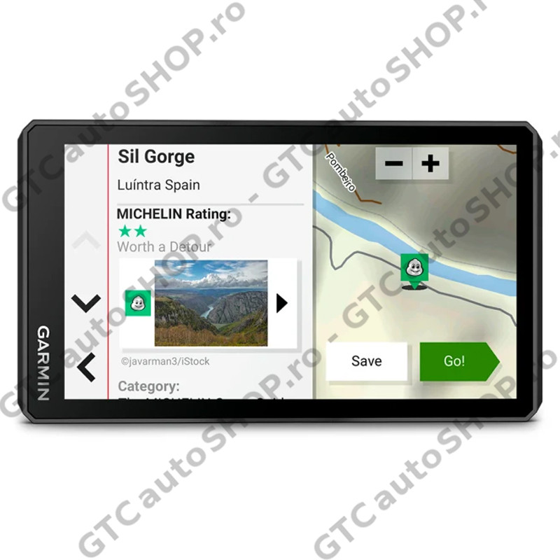 - Funcţii de Navigaţie: planificator de rute vizuale, ghidare pe baza reperelor Garmin Real Directions, evaluările TripAdvisor pentru puncte de interes, stabilirea rutei pe străzile şi prin oraşele preferate, vizualizare intersecţie (afişează semne intersecţie), indicator limită viteză (afişează limita de viteză pentru majoritatea drumurilor principale), alerte pentru şofer privind curbele strânse, şcoli, semafoare, radare şi altele