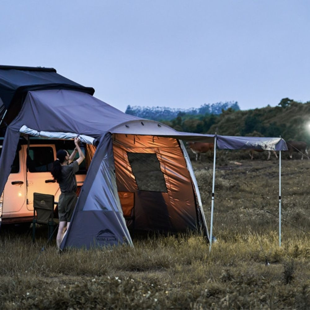 - Spațiu Generos: Se atașează la streașina cortului de pe acoperiș și creează o zonă de living confortabilă, perfectă pentru camping.