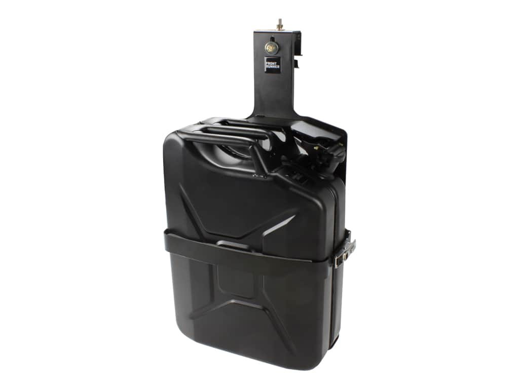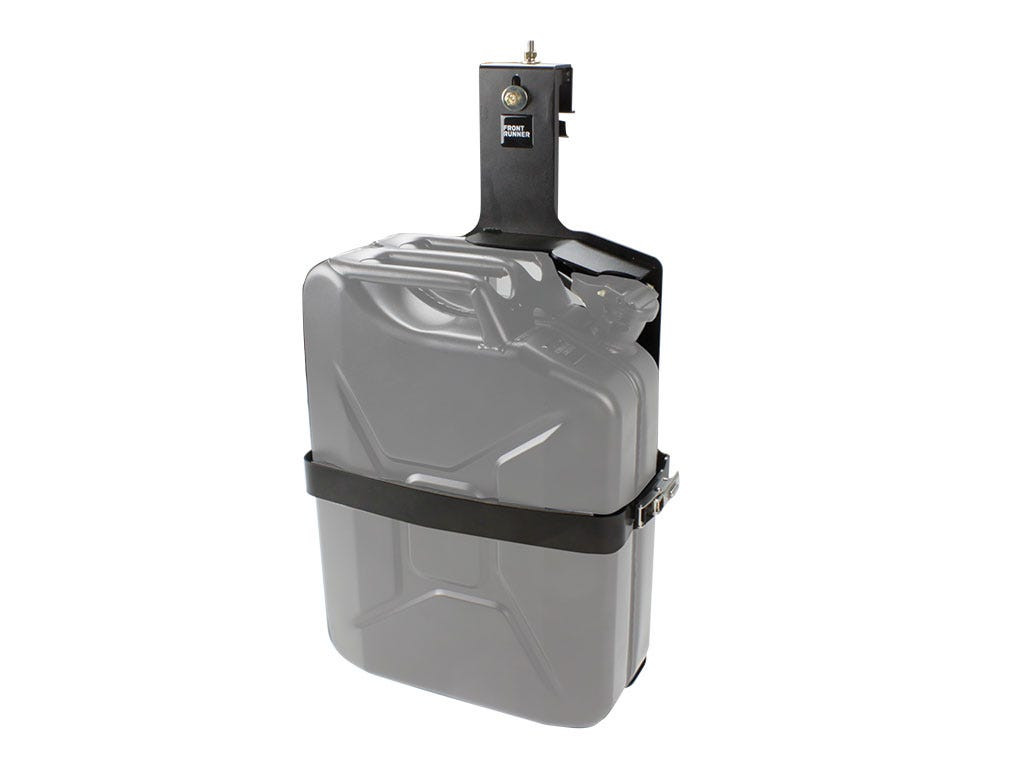 Același suport Front Runner cu încuietoare pentru canistră Jerry Can, robust și rezistent pentru utilizare off-road, acum reconfigurat convenabil pentru montaj pe lateralul vehiculului, printr-un suport de jgheab.