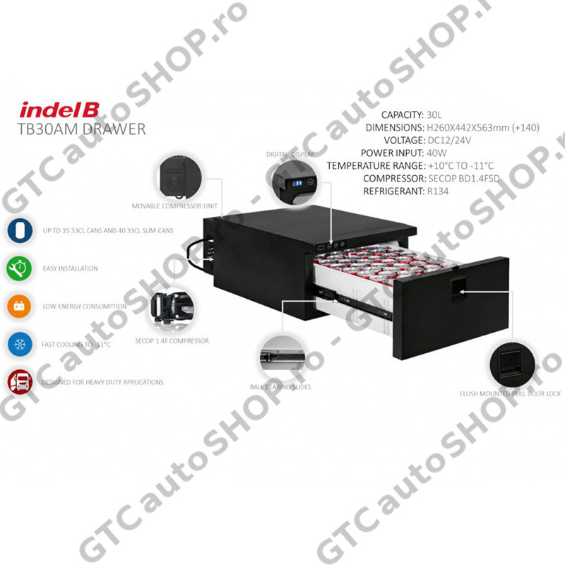 Frigiderul are capacitate de 30 litri si este dotat cu compresor electric ventilat Secop. Se poate monta in orice autovehicul (autoturism, SUV, microbuz, camion, etc.) deoarece se alimenteaza la 12V cat si la 24V. Pe langa forma sa compacta de tip sertar, compresorul se poate detasa din spatele frigiderului astfel incat sa fie montat in alta parte. Frigiderul poate fi montat in bena masinii, in portbagaj, pe bancheta spate a unui autoturism, chiar si in sistemul de sertare a unui pick-up/SUV.