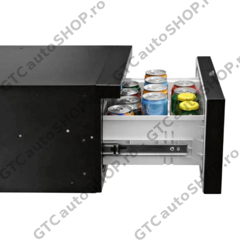 Frigiderul poate fi utilizat cu usurinta, se actioneaza manerul din partea frontala si se trage, acesta culisand pe rolele speciale, fara a fi nevoie de doua maini pentru a-l deschide. Sinele culisante sunt prevazute cu rulmenti pentru a aluneca usor si pentru a fi cat mai silentios. In partea frontala este un panou cu trei butoane: doua pentru setarea temperaturii interioare si un buton ce va permite sa porniti/opriti frigiderul. Display-ul digital va permite sa vedeti in orice clipa temperatura interioara a compartimentului de racire.
