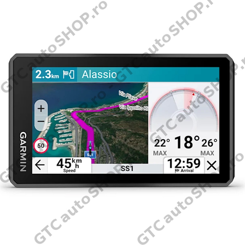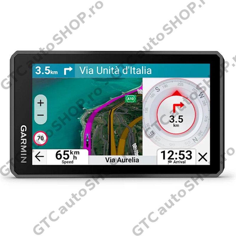 - Funcţii de Navigaţie: Planificator de rute vizuale, ghidare pe baza reperelor Garmin Real Directions, evaluările TripAdvisor pentru puncte de interes, stabilirea rutei pe străzile şi prin oraşele preferate, actualizări din trafic (cu Aplicaţia Garmin Tread), vizualizare intersecţie (afişează semne intersecţie), apelare Bluetooth (funcţionează cu casca, setul de căşti sau smartphone-ul. Compatibil BLE.), indicator limită viteză (afişează limita de viteză pentru majoritatea drumurilor principale), alerte pentru şofer privind curbele strânse, şcoli, semafoare, radare şi altele