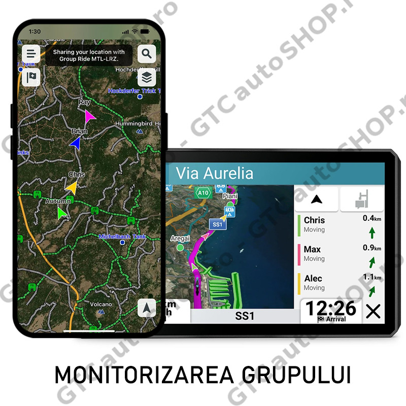 Monitorizarea grupului - Folosește aplicația Tread pe smartphone și/sau dispozitivul zūmo XT3 pentru a-ți monitoriza prietenii cu funcția mobilă pentru curse în grup (este necesară acoperire mobilă). Sau, pentru cursele în afara acoperirii de rețea mobilă, folosește accesoriul Tracker pentru curse în grup cu Adaptor Y pentru tracker cursă în grup (fiecare comercializat separat) pentru a monitoriza alți motocicliști echipați cu dispozitive de navigație zūmo sau Tread compatibile.