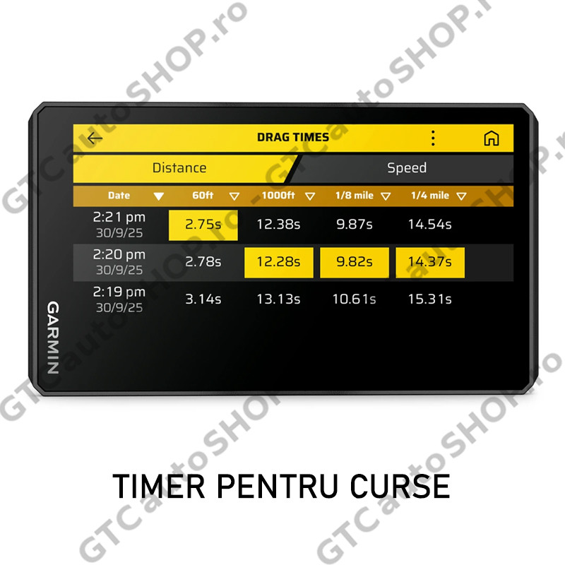 Timer pentru curse - Înregistrează-ți timpii de la 0 la 60 mph și timpii pe 1/8 mile și 1/4 mile cu un Garmin Performance Package.