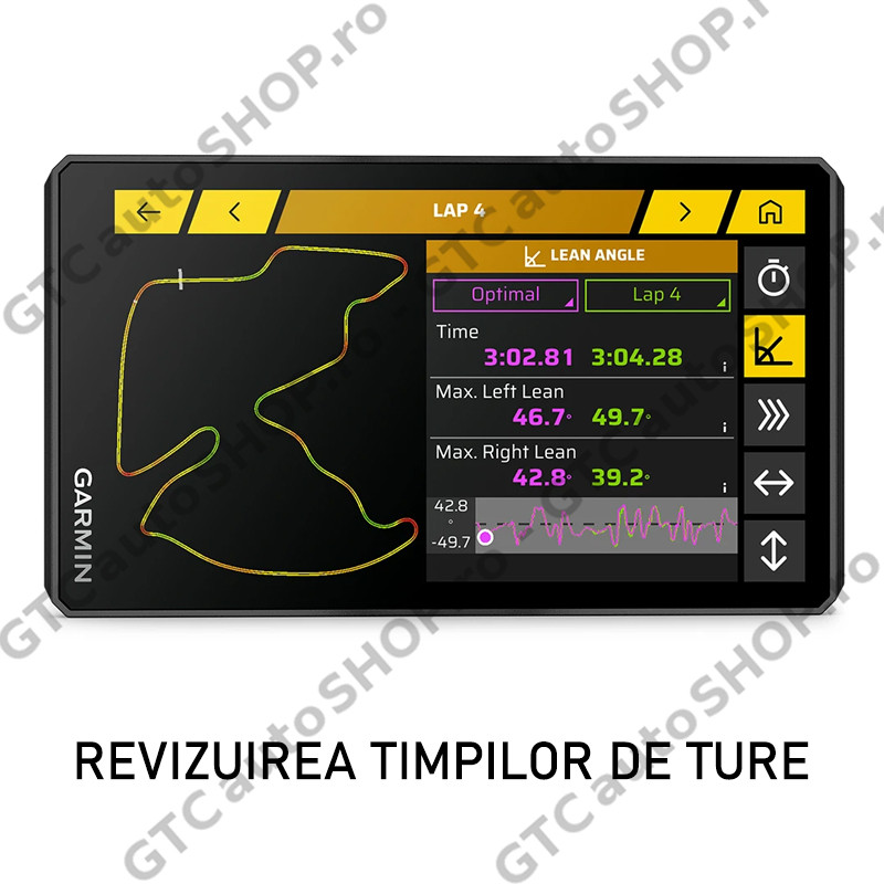 Revizuirea timpilor de ture - Vezi timpii de ture, parametrii cursei, timpii delta și unghiurile de înclinare în fiecare viraj și multe altele cu un Garmin Performance Package.