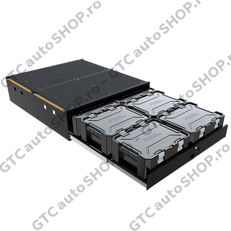 Wolf Pack Pro, inima acestui sistem modular de depozitare, sunt de dimensiuni perfecte pentru sustinerea bucatariei, produse uscate, unelte, echipamente foto, produse de toaleta, chiar si haine. Aceste containere de depozitare Wolf Pack Pro, care se inchid cu un sistem de inchidere pe blocare, sunt stivuibile si durabile, fabricate din plastic negru de inalta rezistenta si au manere integrate pentru transport usor. Optional se pot pune in cutiile Wolf Pack Pro, separatoare (cod SBOX052, vandut separat) sau cutii pliabile (cod SBOX027, vandut separat) pentru a proteja echipamentele fragile sau foto. Sinele de rulare de mare rezistenta permit sertarului sa se extinda aproape 100% de la baza fixata. Echipat cu un mecanism de blocare, sertarul ramane in pozitie cand este inchis si poate fi incuiat cu cheia din dotare pentru un plus de siguranta.