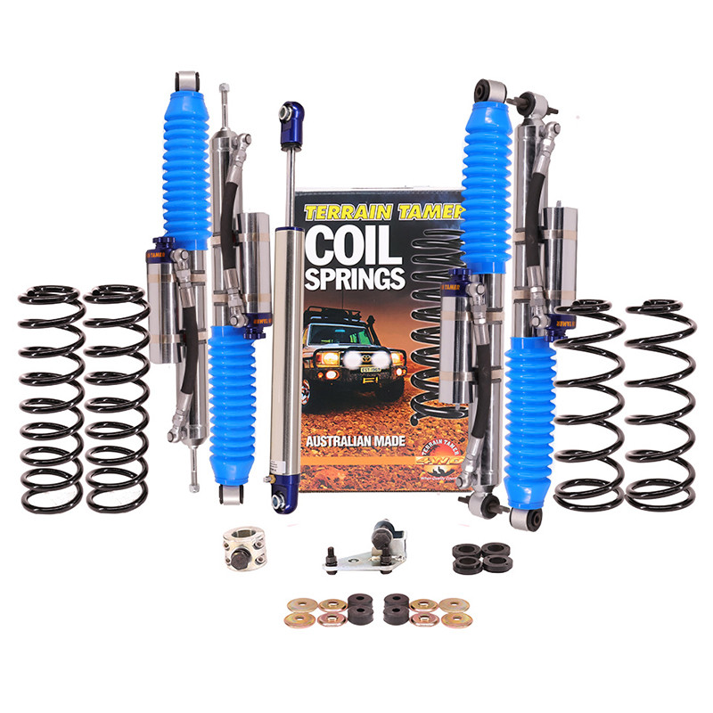 Kit suspensie PRO cu amortizoare cu rezervor si reglaj de la Terrain Tamer Australia pentru Jeep Wrangler JK, fabricatie 2007 - 2017, ce asigura inaltarea masinii cu circa 4-5 cm.